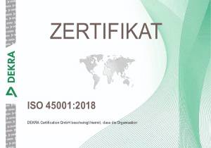 Die DEKRA Certification bescheinigt, dass das Unternehmen Nickelhütte Aue GmbH ein Managementsystem für Arbeits- und Gesundheitsschutz eingeführt hat und anwendet. Die Norm beschreibt Anforderungen an ein Arbeitsschutzmanagementsystem sowie eine Anleitung zur Umsetzung.
