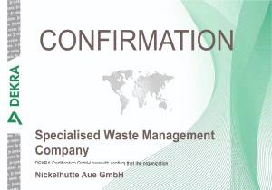 Nickelhütte Aue GmbH passes through certification processes at regular intervals, during which it is audited by the responsible certification authorities for the quality of its work. These audits are subject to strict specifications. Nickelhütte Aue GmbH underwent certifications in the following areas.